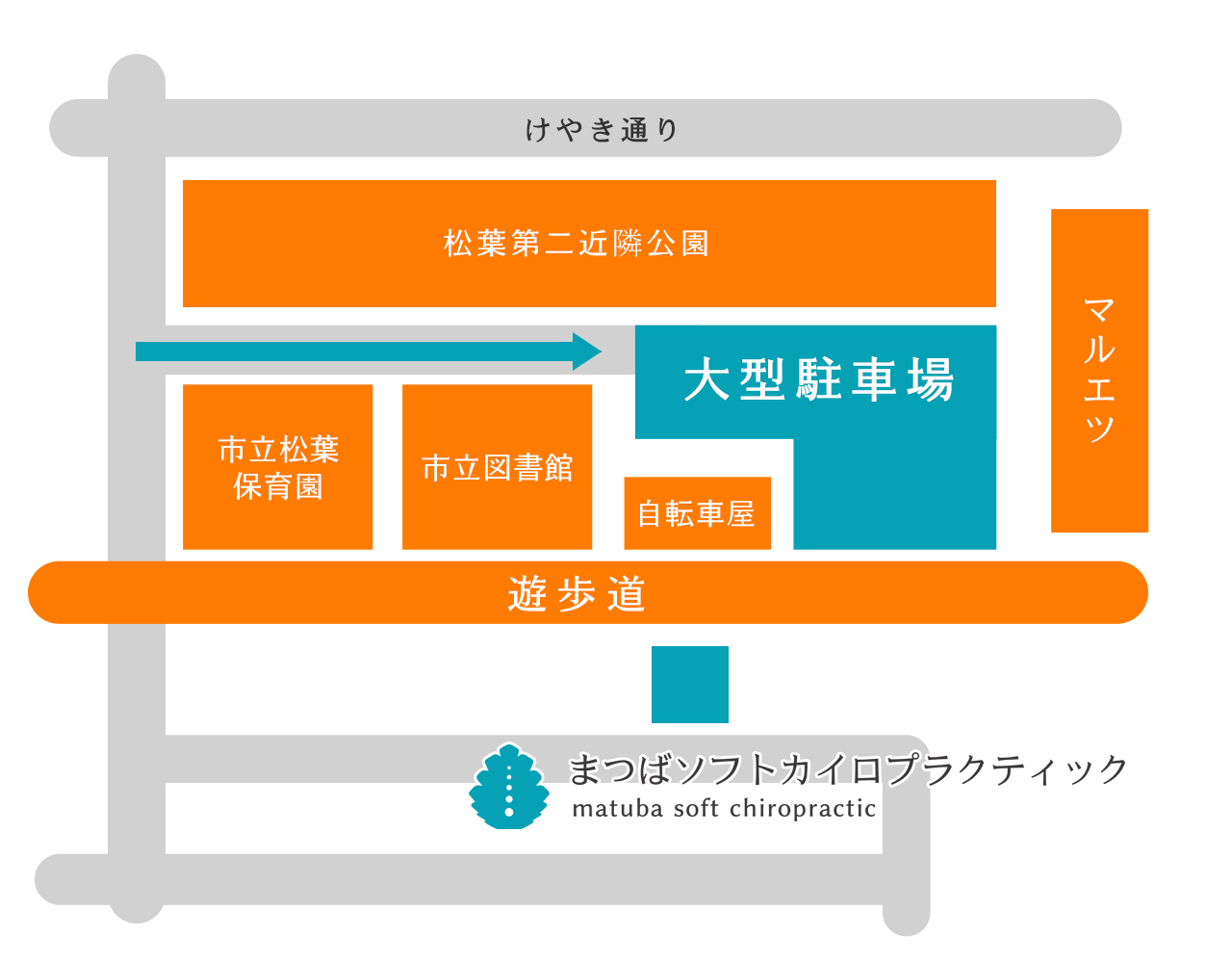 市立松葉保育園と松葉第二近隣公園に挟まれている道路が駐車場入口への道路となります。
