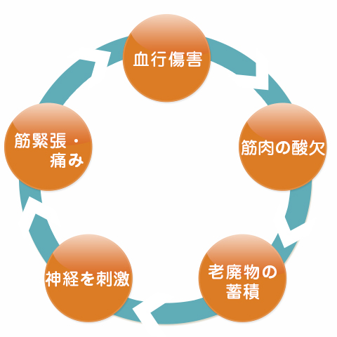 緊張を起こせば、毛細血管もしめつけられて、血流が悪くなる、すると筋肉内の老廃物(乳酸)の排出がうまくいかなくなり、筋肉内に蓄積され、さらに筋の緊張をお越し、それが知覚神経を刺激して痛みが増強し、さらに緊張となり悪化します。